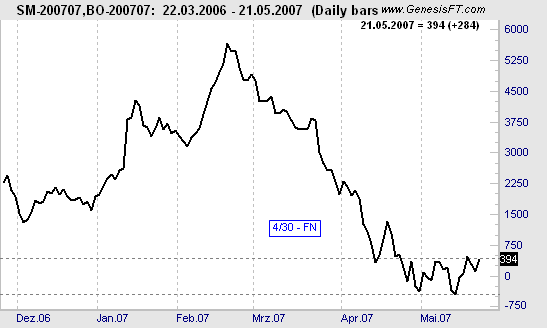Today we consider an inter-market equity spread: long July 07 Soybean Meal and short July 07 Soybean Oil (100*SMN7 – 600*BON7). After being in a down trend for more then two months, the spread has been in a sideways market since the end of April. Is this the end of the long term down trend and the begin of its seasonal up move?