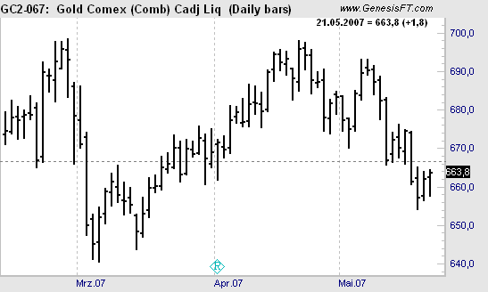 On May 14 we told subscribers of our professional daily spreads & position trading newsletter, Traders Notebook,"Consider selling June Gold at 667.4 stop market (all sessions). Initial margin is $2,700. Suggested stop at 677.7 (app. $1,100). Initial projected objective is 660, then a move down to 640 or lower. Basis is seasonal (app. 5/10 – 6/10) and a Traders Trick Entry in front of a Hook."