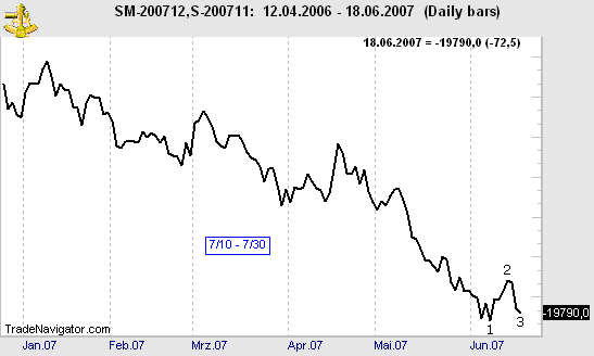 07 Soybeans (100*SMZ7 – 50*SX7). The spread has been in a down trend