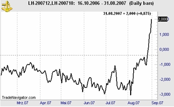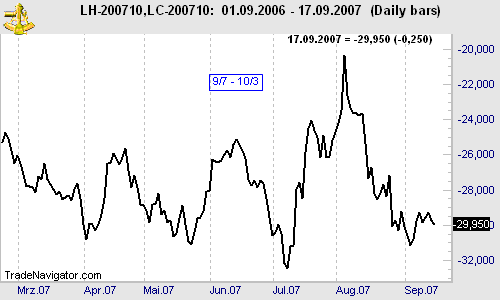 Today we consider an inter-market meats spread: long October 07 Lean Hogs and short October 07 Live Cattle (LHV7 – LCV7). After a strong downmove in August, the spread stopped again at the level of around -31.00 (same low as in April 2007 and May 2007). Now we get the chance to enter on a possible 1-2-3 low at the moment the spread makes a new high. The time window goes from approximately 09/07 till 10/03, with a winning percentage of over 87% (13 winning trades in the last 15 years).