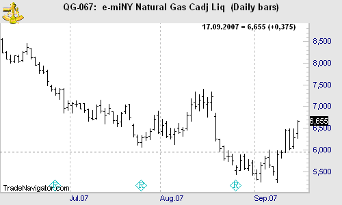 On September 9 we told subscribers of our professional daily spreads & position trading newsletter Traders Notebook, "Consider buying October e-miNY Natural Gas at 5.62 stop market (if open <= 5.60). Initial margin is $2,700. Suggested stop at 5.25 (app. $925). Suggested first target at 5.97, then 7.00 or higher. Basis is a TTE in front of a 1-2-3 low. Comment: If the suggested stop is too far, suggest a closer stop at 5.40. I personally would be careful taking the trade overnight due to low volume "