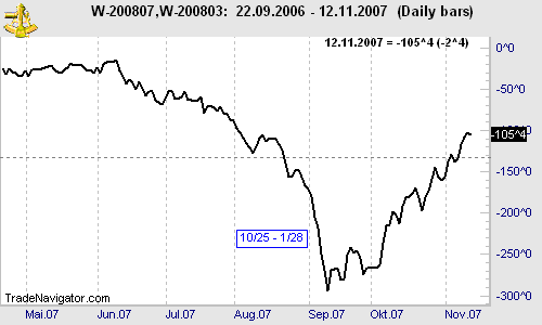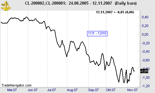 Today we consider a calendar spread: long February 2008 Crude Oil NY and short January 2008 Crude Oil NY (CLG8 – CLF8). As we all know, Crude Oil moved up like a rocket in the last few months. Because we are looking at a bear spread (nearby month is on the sell side), the spread moved down in the same time period. Now it looks like the spread could break out to the up side, after being in a trading range for a few weeks. Will a breakout to the up side be the beginning of its seasonal up move? I personally would wait for a nice breakout of the range on the close, and then enter MOC the next day. Suggest entering into the elec. contracts.
