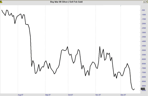 Today we consider an intermarket calendar spread in the metals complex: long February 2008 Silver and short March 2008 Gold. You can take this trade in the Chicago markets at the CBOT, or in the New York markets at the NYMEX. The symbols will differ.