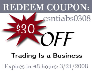 on. If you decide to purchase Trading Is a Business within the next 48 hours, we urge you to redeem the coupon code csntiabs0308 — read below: