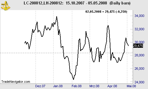 On April 23 we told subscribers of our professional daily spreads & position trading newsletter Traders Notebook, "Consider entering an inter-market meats spread LCZ8 – LHZ8 at 27.85 stop market. Initial margin is $1,492 (reduced margin). Suggested risk is $600. Initial projected objective is $500, then 32 or higher. Basis is seasonal (5/7 – 5/27) and a 1-2-3 low."