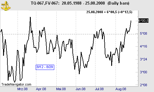 On August 8 we told subscribers of our professional daily spreads & position trading newsletter Traders Notebook, "Consider entering an interest rates spread (ECBOT) USU8 – FVU8 at 4^14 stop on close. Initial margin is $3,510 (no reduced). Suggested risk is $1,000. Initial projected objective is $1,000, then higher. Basis is seasonal (8/12 – 8/29) and a 1-2-3 low. Comment: the break out of the August high is the only entry I see at the moment but maybe we get something else during the next days. I let you know."