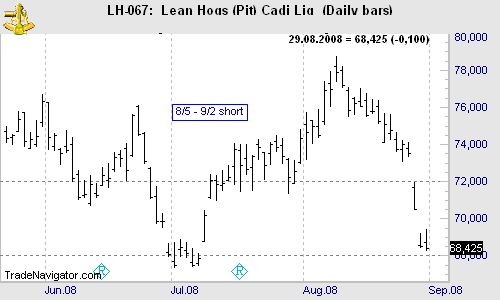 Today we consider a Live Cattle (Globex) calendar spread: long February '09 Live Cattle and short December '08 Live Cattle (LCG9 – LCZ8). After a choppy downmove in June and July '08, the spread seems to bottom out around break even. Seasonality (09/03 – 11/05) should help this spread to move back up to 2.0 or even higher. Break even could be a logical place for an initial stop.