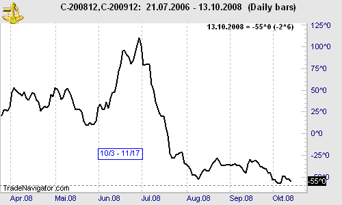 Today we consider a Corn inter-crop year calendar spread (ECBOT): long December '08 Corn and short December '09 Corn (CZ8 – CZ9). The spread has been trading in a range between -55 and -30 since August 2008. Will seasonality (10/03 – 11/17) help to move the spread higher? The October low at -57 seems to be a good place for an initial stop.