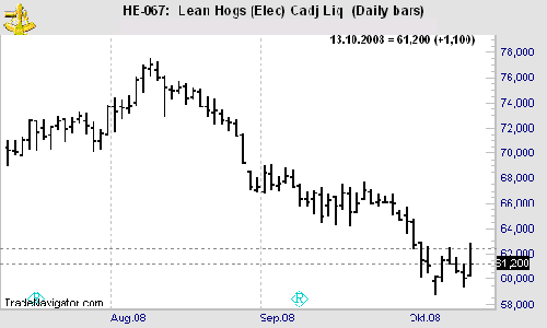 On October 8 we told subscribers of our professional daily spreads & position trading newsletter Traders Notebook, "Consider selling December Lean Hogs (Globex) at 61.15 stop market (pit session, no entry on gap open). Suggested stop at 62.60 ($600). Suggested first target at 59.50, then lower. Basis is a TTE in front of a RH and a down trend."