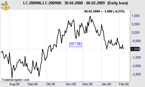 This week we look at LCM9 – LCQ9: long June '09 Live Cattle and short August '09 Live Cattle (CME).