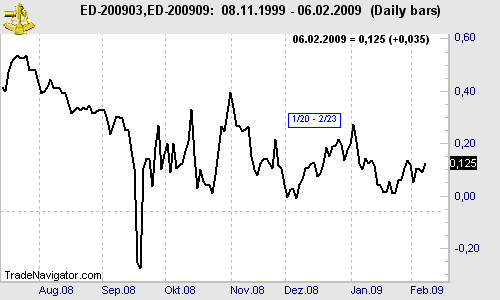 On January 26 we told subscribers of our professional daily spreads & position trading newsletter Traders Notebook, "Consider entering a Eurodollar calendar spread (Globex) EDH9 – EDU9 at a close above 0.085. Please ask your broker about the margin. Suggested risk is $350. Initial projected objective is $350, then a move to 0.40 or higher. Basis is seasonal (1/20 – 2/23) and a possible resistance around break even."