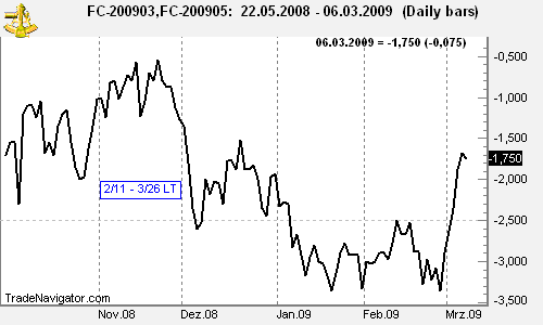 Today we consider a Chicago Wheat calendar spread (ECBOT): long July '09 Wheat and short May '09 Wheat (WN9 – WK9). After being in a downtrend in November and December 2008, it seems the spread has found its bottom at around 10. The spread has been moving up in stair steps since then, and the January resistance level of 11 ¾ became support in February. Will seasonality (02/15 – 04/09) help to move the spread higher?