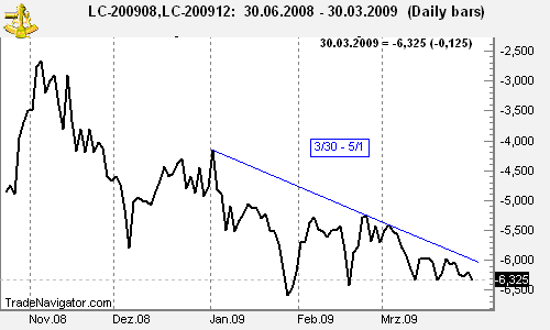 Today we again consider again a Live Cattle calendar spread (CME): long August '09 Live Cattle and short December '09 Live Cattle (LCQ9 – LCZ9). The spread has been forming a flag formation, waiting for a breakout to one of both sides. Will a breakout to the upside be the start of its seasonal (03/30 – 05/01) up move? If so, the spread has potential to move up to -3.0 or even higher.
