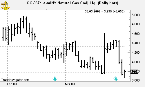 On March 25 we told subscribers of our professional daily spreads & position/swing trading newsletter Traders Notebook, "Consider selling the May Mini Natural Gas at 4.325 (after 7:00 AM CT). Suggested stop (and reverse) at 4.380; suggested first target at 4.270. Basis is a reversal bar."