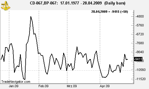 newsletter Traders Notebook, "Consider entering a currency equity spread 1000*CDM9 – 625*BPM9 (Globex) at a close above -$9,960. Initial margin is $7,040 (fractionalized credits). Suggested risk is $2,000. Initial projected objective is $2,000, then a move higher. Basis is seasonal (4/25 – 5/11) and a 1-2-3 low. Comment: Currency spreads are usually volatile and recommended only for those with deep pockets!"