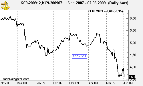 Today we consider a Coffee calendar spread (ICE): long December '09 Coffee and short July '09 Coffee (KCZ9 – KCN9). After trading mainly sideways in the first 4 months, the spread made a new 2009 low at 3.60 in May. Will this low hold, and can seasonality (05/15 – 06/11) help to move the spread higher?