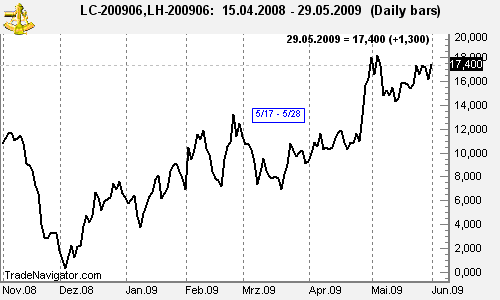 newsletter Traders Notebook, "Consider entering an intra-market meat spread LCM9 – LHM9 at a close above 15.25. Initial margin is $1,418 (reduced) Suggested risk is $1,200. Initial projected objective is $1,200, then a move higher. Basis is seasonal (5/17 – 5/28) and a 1-2-3 low."
