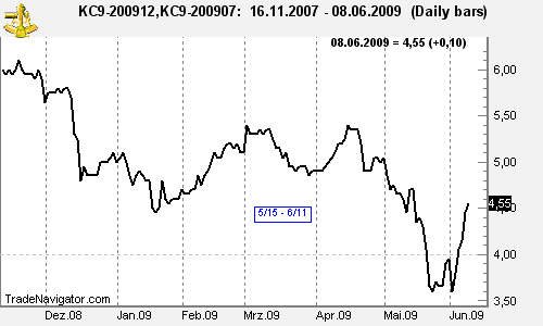 newsletter Traders Notebook, "Consider entering a Coffee (ICE) calendar spread KCZ9 – KCN9 at a close above 3.70. Initial margin is $280 (reduced). Suggested risk is $200. Initial projected objective is $200, then a move to 4.8 or higher. Basis is seasonal (5/16 – 6/11) and a 1-2-3 low. Comment: Please let me check the liquidity of this spread with my broker today. I will send out an email."