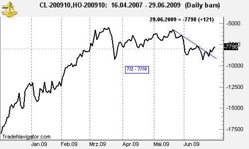 Today we consider an inter-market equity spread in the energies (NYMEX): long October '09 Crude Oil and short October '09 Heating Oil (1000*CLV9 – 420*HOV9). The spread has been trading in a trading range between -$9,200 and -$5,500. After testing the March low again in June, the spread seems to be ready to move higher (also, the blue line indicates a break of the short term downtrend). Will seasonality (07/02 – 07/19) help to move this spread higher? Because of the different values of each unit move of the Crude Oil and the Heating Oil, we have to multiply the buy side by 1000 and the sell side by 420 to get the right equity chart. The spread is 1:1.