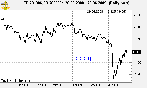 newsletter Traders Notebook, "Consider entering an Eurodollars calendar spread EDM0 – EDU9 at a close above -1.135. Please ask your broker about the margin. Suggested risk is $700. Initial projected objective is $700, then a move to -0.40 or higher. Basis is seasonal (5/30 – 7/11) and a possible 1-2-3 low. Comment: the spread is very volatile, that’s why I am recommending such a high risk."
