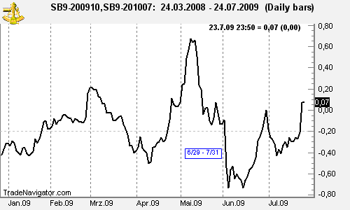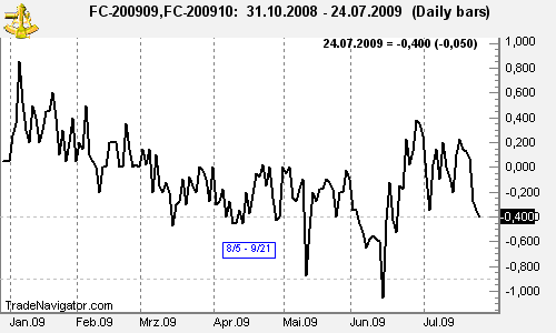 Today we consider a Feeder Cattle calendar spread (Globex): long September '09 Feeder Cattle and short October '09 Feeder Cattle (FCU9 – FCV9). The spread has been trading in a poorly defined trading range. After testing the May low again in June, it seems the trading range shifted higher in July (between approx. -0.50 and +0.20). I recommend a scale-in approach, entering with two separate lots. Consider an entry with the first lot at -0.40, and the second lot at -0.90.