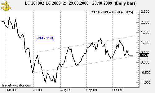 Today we consider entering a Live Cattle calendar spread: long February 2010 Live Cattle and short December 2009 Live Cattle (LCG0 – LCZ9). The spread has been trading in an uptrend channel since July. Traders who are looking for a low risk entry might want to enter the spread at the current level. As long as the spread stays above the lower channel line, seasonality (09/14 – 11/08) might help in moving the spread back to the upper side of the channel or even higher.
