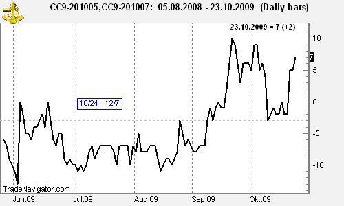 On October 15 we told subscribers of our professional daily spreads & position/swing trading newsletter Traders Notebook, "Consider entering a Cocoa calendar spread: long May and short July Cocoa (CCK0 – CCN0) at a close above -1. Suggested risk is $100; suggested first target at 9, then higher. Basis is seasonal (10/24 – 12/7) and a 1-2-3 low."