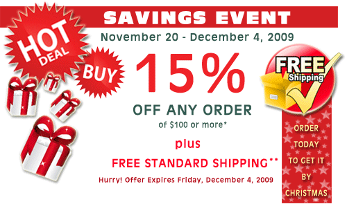*DISCOUNT OFFER: Don't miss out! Order online by 11:59 p.m. CT, December 4, 2009, to get free standard shipping plus save 15% on your purchase of $100 or more. Discount applied to product total only. Gift cards not included. Shop any link in this e-mail or on our websites.
