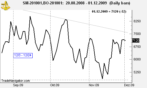spreads & position/swing trading newsletter Traders Notebook, "Consider entering an inter-market spread: long January Soybean Meal and short January Soybean Oil (100*SMF0 – 600*BOF0) at a close above $5,800. Suggested stop at $4,800; possible first target for multiple lot traders at approx. $8,000. Basis is seasonal (12/3 – 12/24) and a 1-2-3 low. Comment: There is a similar trade using the March contracts with an optimized entry date on 11/27. Both trades are similar but the January contracts look stronger. Based on the entry you should calculate a risk between $1,500 and $2,000 per lot."